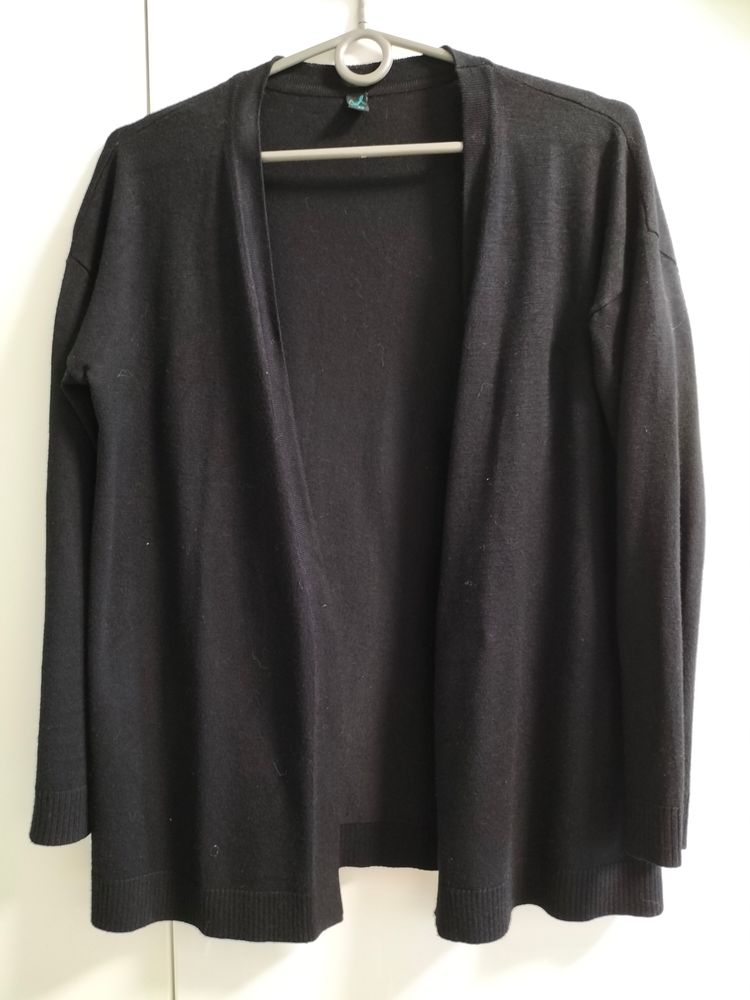 Кардиган черный, длинный рукав, длина до середины бедра, по бокам небольшие разрезы, без застёжки, надет пару раз, разм. 42, экв. 1000