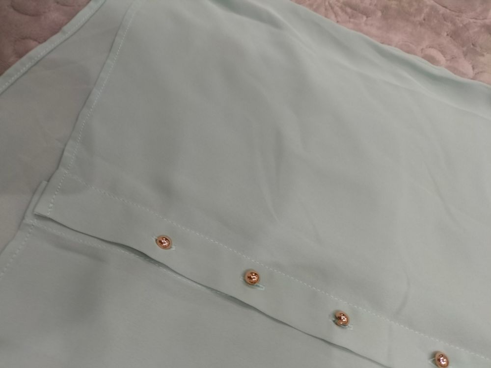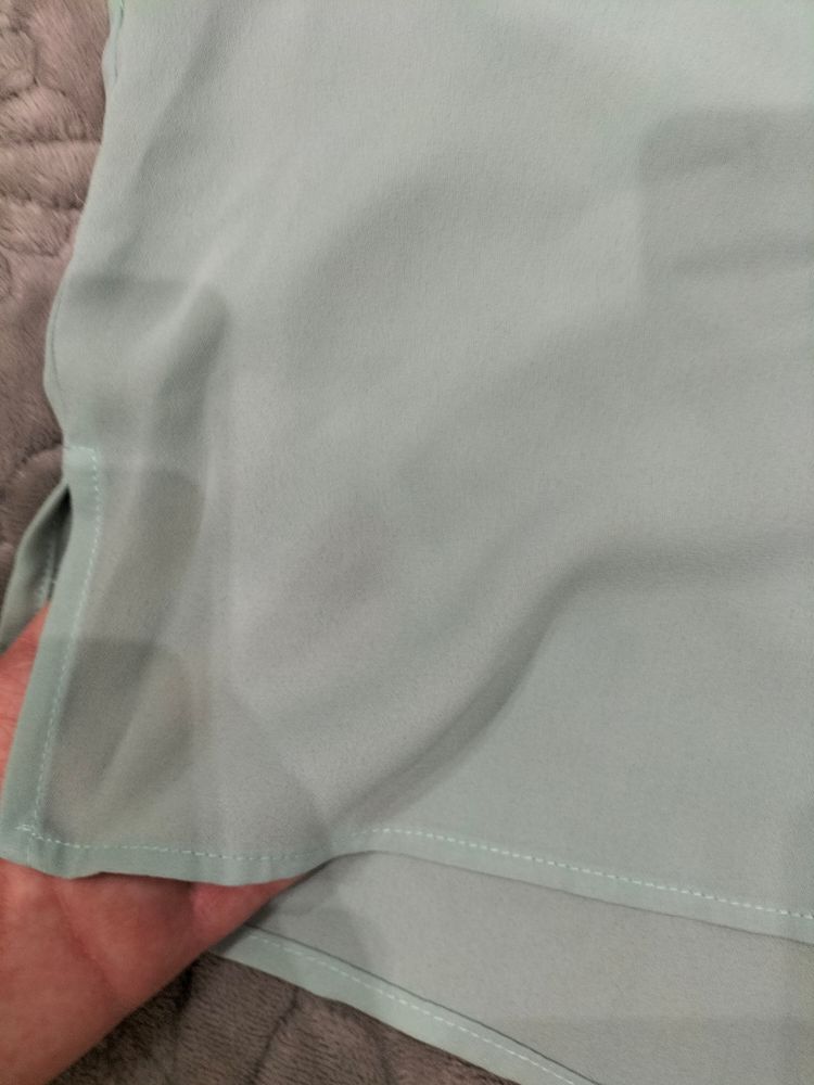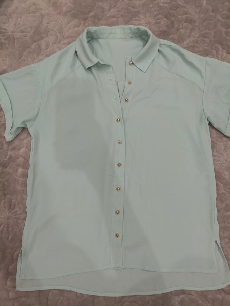 Блузка приглушенного мятного цвета, золотистые пуговички, ткань типа плотного шифона, лёгкая, приятная, надета пару раз, разм. 44, экв. 500