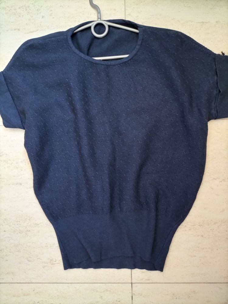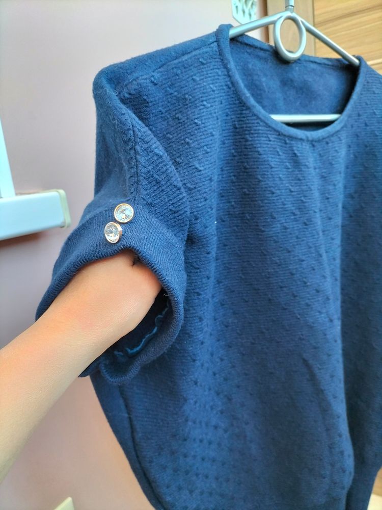 Тёмно-синий свитер с коротким рукавом и пуговичками, впереди вязка с рисунком, надет пару раз, разм 42-44, цвет на первом фото реальнее, экв. 800 руб
