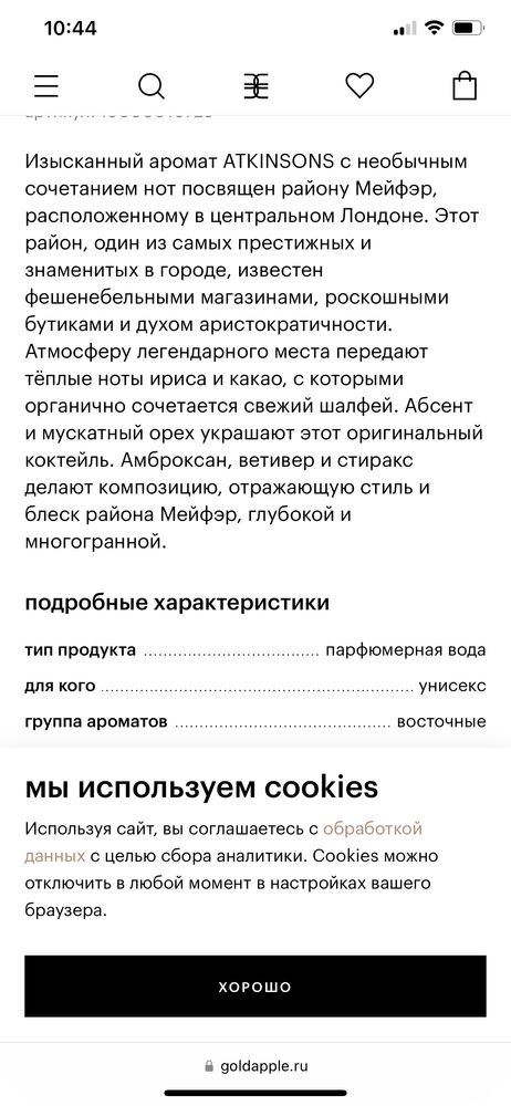Шлейф почти прозрачный, но все же уловимый, чем ближе к коже - тем насыщеннее и гуще аромат. Стойкость безупречная: с утра и до позднего вечера, слегка меняясь, «Gоld Fаir In Маyfаir» будет благоухать на вашей коже, пока не останется только запах замши и ирисов.