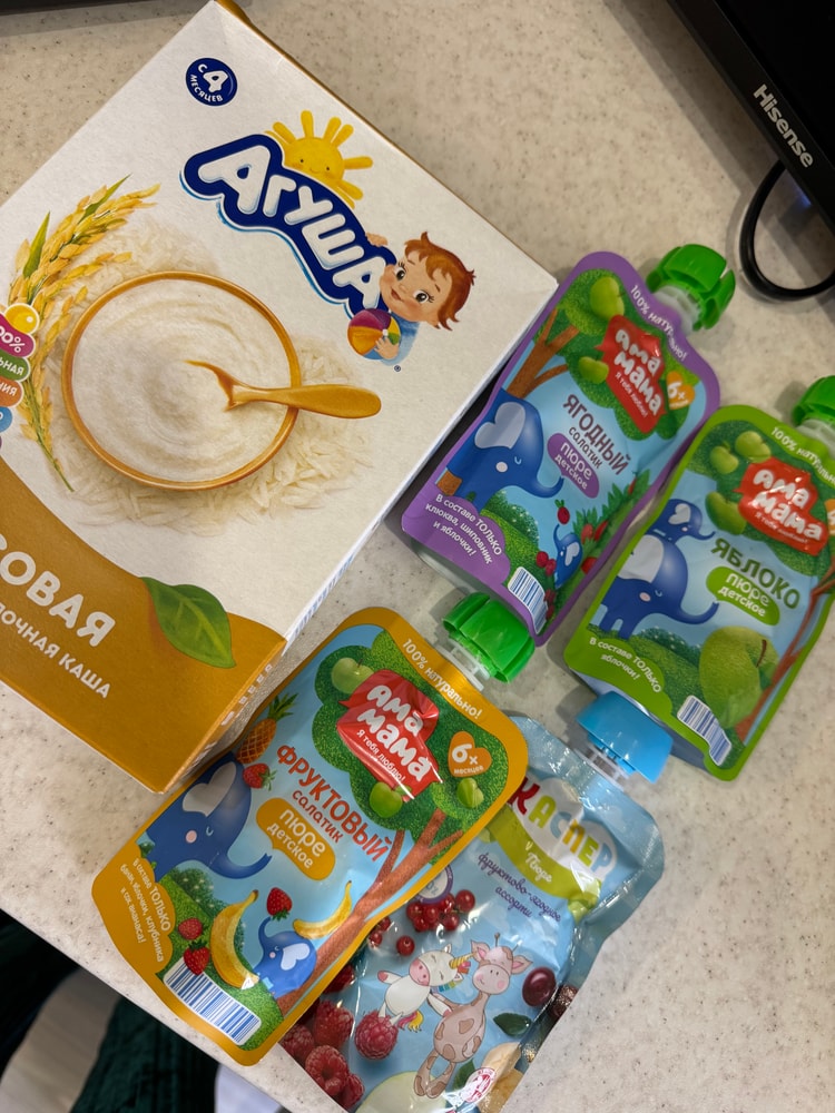 Осталась только рисовая каша , могу добавить фруктовые пюре в мягкой пачке
