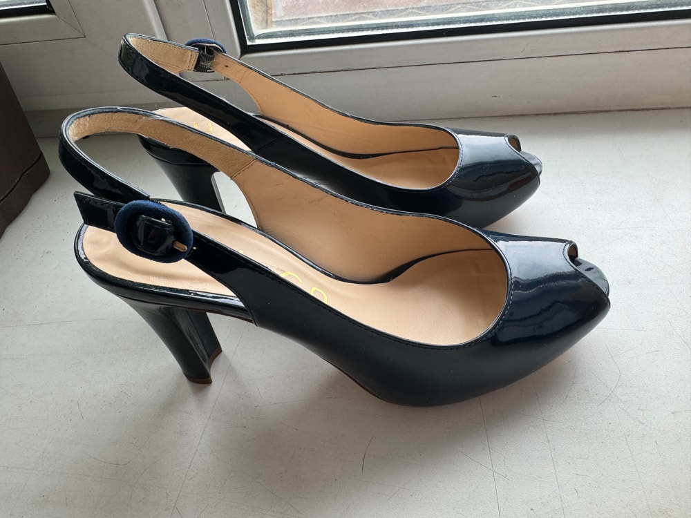 3. Туфли с открытым носом Испания Lady star, полностью кожа, высота каблука с учётом платформы 8,5 сантиметров длина по стельке 25 см, БУ – 1500 экв