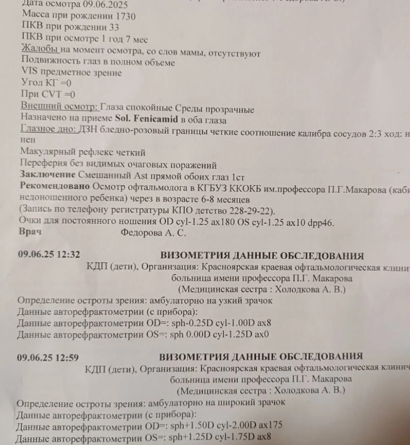Развитие детей от 1 года до 3ех летДевочки! Всем привет! Очень нужна консультация и ваш опыт. Кто не сталкивался просьба не комментировать, не отвлекать. Ребенок родился в 33 недели. По моей линии есть расположенность к близорукости. Наблюдались на наличие ретинопатии, в год она ушла. Но тут в 1,7 нам поставили астигматизм. Я в шоке. В полтора года носить очки. Сразу скажу, капали каплями которые быстро расслабляют мышцы. Ребенок очень плакал и крутился. Сходили к платному она сказала что если и есть погрешность, то небольшая, а значит скорее всего будут очки. Но удивилась что не назначили нам капли которыетнадо 3 дня капать. Девочки, у кого была похожая ситуация и подросли дети, как вы? Остались очки? Что вообще делать? Платный врач сказала пока пол года погулять, потом приди к ней. Я приложу последние замеры