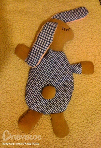 Мы долго кроили, вырезали, наметывали, распарывали, спорили и в итоге после 4 часов творческих "ммучений" появился вот такой сонный зайка-грелка