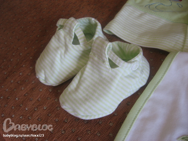 Этот комплект тоже на размер 62 уже, ближе к 3-м месяцам, очень понравился ))) Особенно пинетки, была просто в восторге, они как маленькие тканевые туфельки.