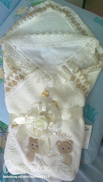 я брала на рынке в детских вещах..куча конвертов висит,а покрывалки лежат и спрашивать надо.да и уголки они тоже у них там лежат в закромах.на виду в основном наборы на выписку,конверт и там распошонка,цепчики,под стать конверту.а я вот сюда отдельно распошонку и чепчик желтенькие,да пленку белую еще (запеленать)и потом уже уголок и само покрывалко