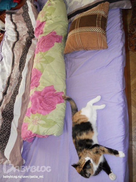 Знакомый наборчик!!!!  Только вместо кошки собака, ноги фиг выпрямишь и конечно же еженочная война за подушки!!!!!