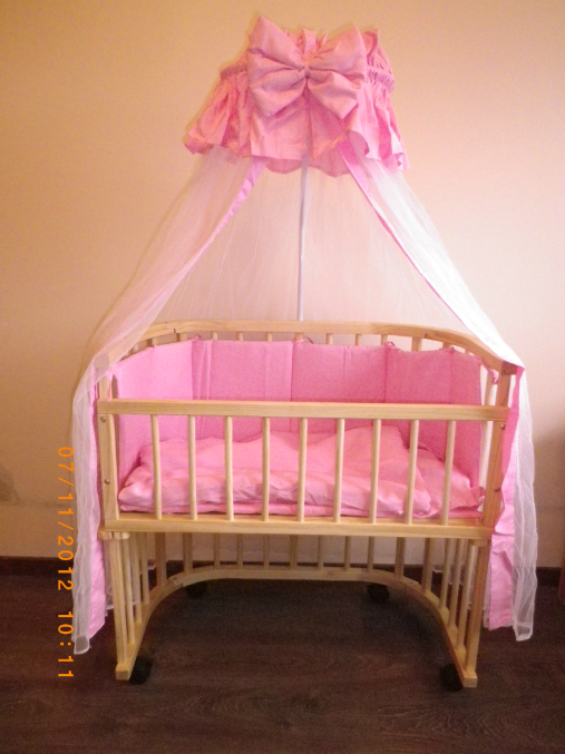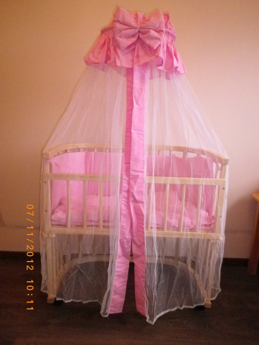 В комплекте с бортиками, балдахином, штативом для балдахина, матрасиком, подушкой и одеялком.