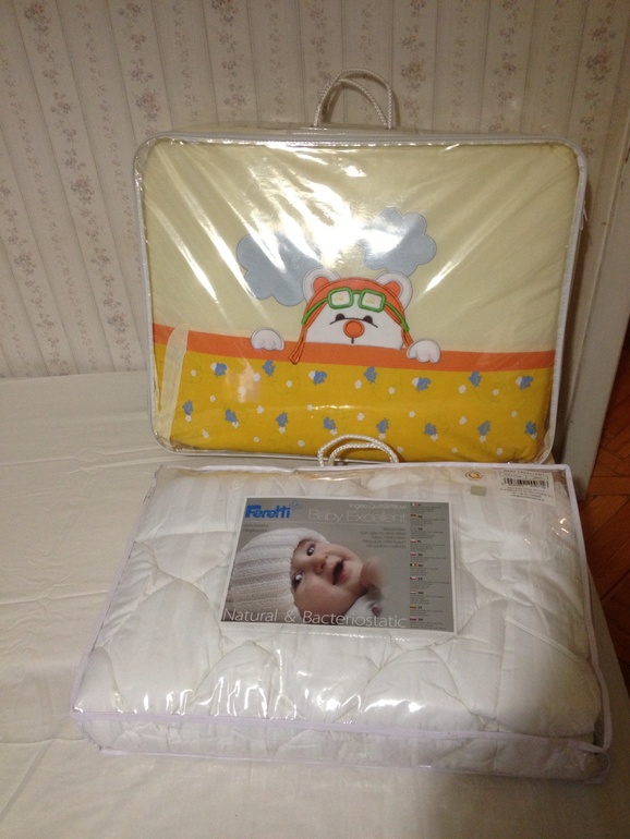 Купила заранее комплект итальянский feretti, состоящий из простыни, наволочки и одеяла теплого с пододеяльником.. Почему его?.. Во-первых, понравилось качество ткани, во-вторых бортики ну очень добротные оказались по сравнению с другими, в-третьих влюбилась в дизайн с зайками..