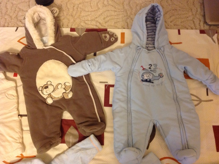 Теперь о вещичках. Описывать не буду, лучше покажу. Сразу скажу - многое из вещей мне передала тетя, которая живет за границей. Некоторые вещички купила б/у, некоторые в магазинах, немного на кидстаф. По размерам - на фото только для новорожденных и 0-3 мес, с бирками полная неразбериха - одни явно видно, что большемерят, другие маломерят, третьи вроде в размер идут. В общем решила не заморачиваться и одевать все по мере роста. Бирюзово-беленькие и серые пинетки с шапочкой-мишкой связала сама))) только надо мишке еще глазки пришить)) Еще связала большой махровый пледик)) его будем наверное в коляску использовать или еще куда-то, потом придумаю.