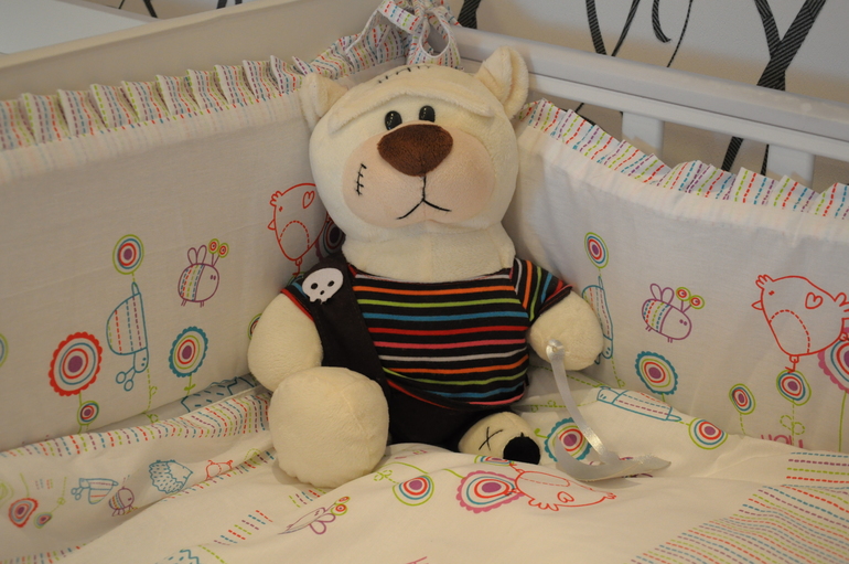 Пока что усадили в кроватку любимого моего медведя-пирата, будет сторожить