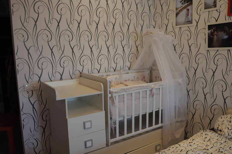 Кроватка, как уже говорила в предыдущих постах - трансформер. Белый цвет, как и задумывалось, отлично вписался в общий интерьер комнаты. Кроватка с маятником, который при необходимости можно застопорить. Модель кроватки СКВ-8, качеством довольна, инструкция более менее понятная, к тому же на каждой детали была наклейка с ее номером, это намного упростило сборку. Еще очень порадовало, что нижний ящик закрытый, можно спокойно складывать туда вещи, не боясь, что они запылятся. Пес пока не покушался, а то мы боялись, что деревянные решетки окажутся для него очень соблазнительными)))