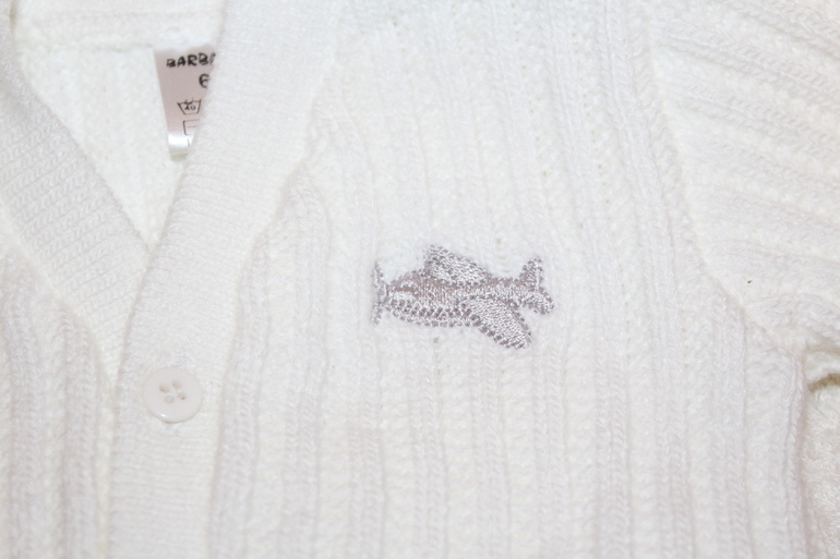 И сверху оденем вот такой супер-тепленький костюмчик. Он белый с вышевкой самолетика, мне очень нравится. Еще хочу носочки вязанные и шапочку тепленькую.