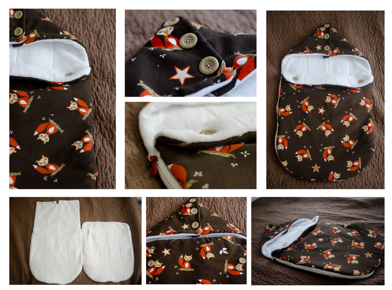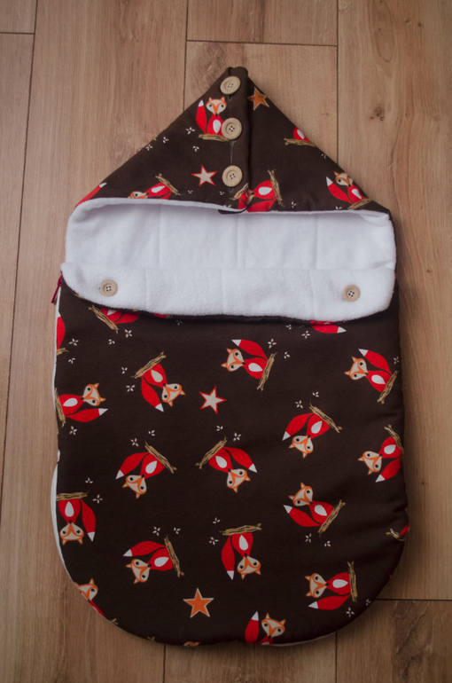 Ткань : верх- итальянская ткань, набивной 100% хлопок, утеплитель - Slimtex 200гр (2 слоя, гипоалергенный, не токсичен, имеет эффект термоса), подкладка - микрофлис (специальный для изготовления детской одежды, гипоалергенный), молния, пуговицы-дерево. Кстати при полном раскрытие его можно использовать как одеялко-подстилка)