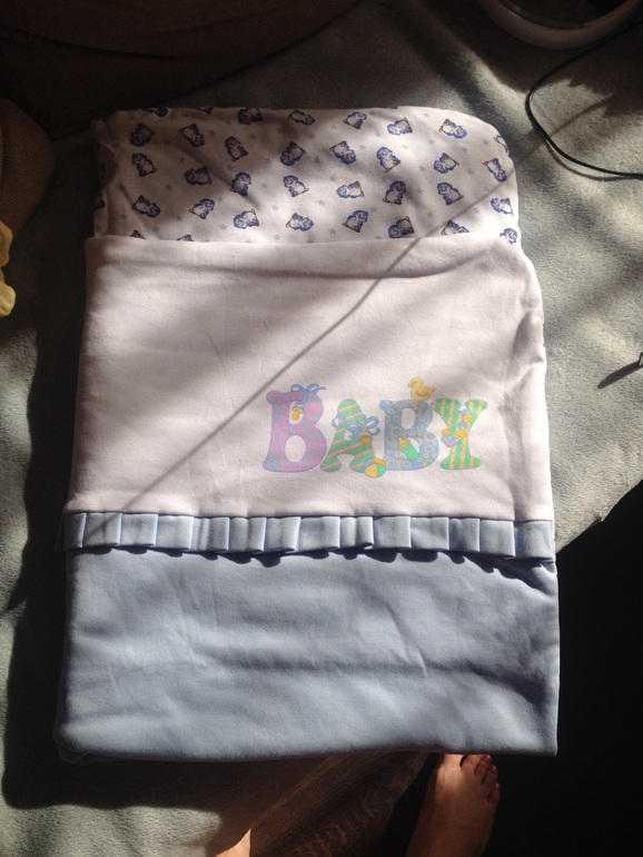 1. Пледик для кроватки - натуральный хлопок покрытие, внутри утеплитель. Изнанка в моих любимых пингвинёнках (полюбила их в зоопарке в Праге), лицевая сторона нежно голубая и сверху так сказать белая часть/полоса. Короче классный и цена отличная 499 рублей