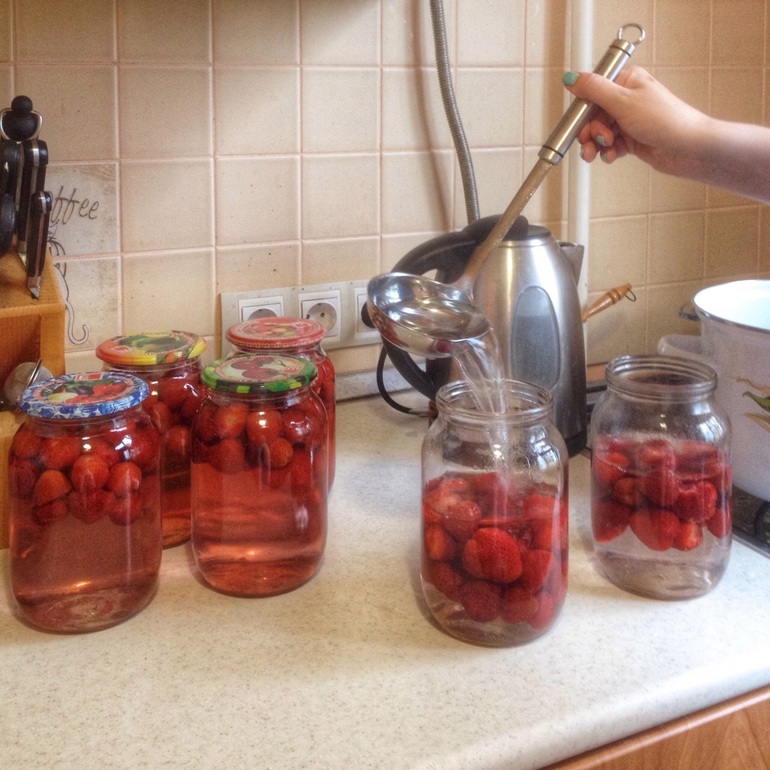 А еще у меня в понедельник случился бзик, купили 4 кг клубники и из большей половины я сделала 6 литров компота на зиму я ни когда этого не делала...