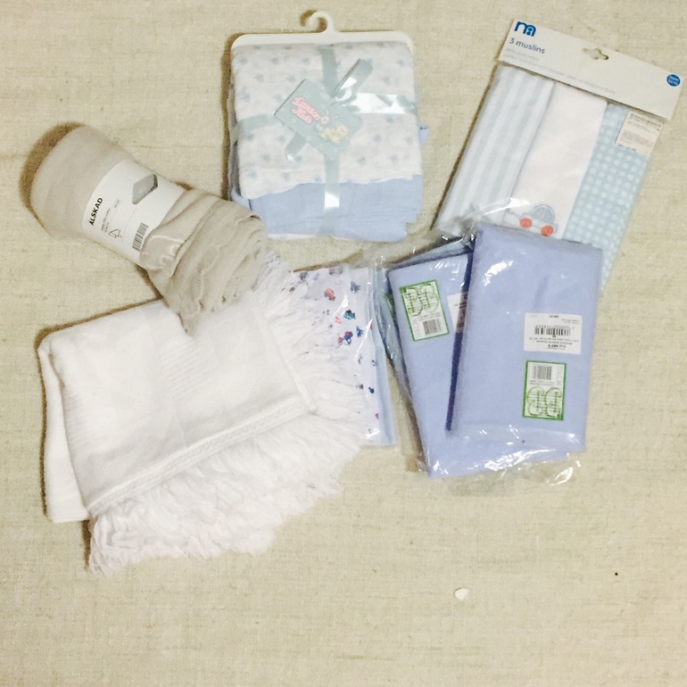 Пеленочки, незаменимые трикотажные, так на подхват ситец, пара пледиков и еще надо фланелевые докупить. От дочки еще несколько нейтральных желтых, зеленых и оранжевых не совковой расцветки