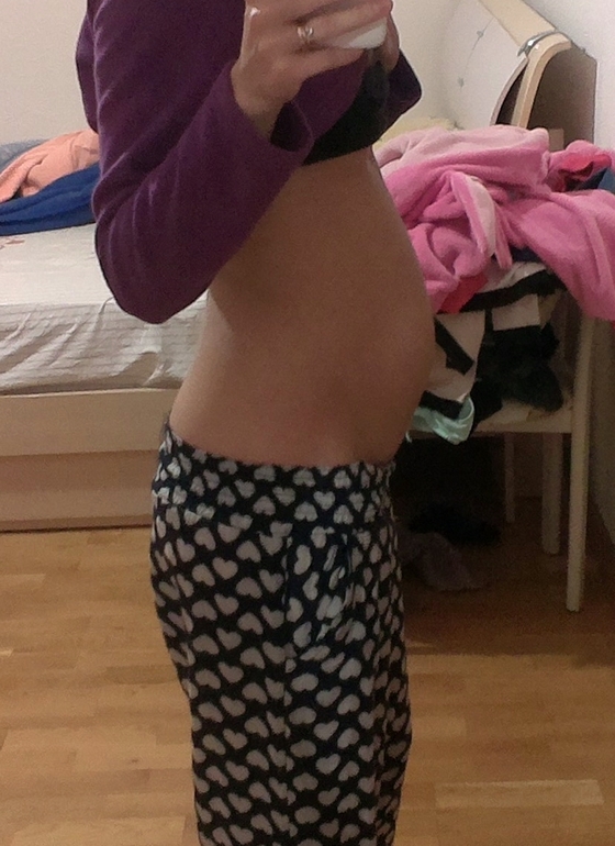 Так же у меня огромный пуз. Я без пресса, и всё выпирает как обычно на вечер. Вес набрала за всё время около 300 грамм всего. Фотка вечерняя, утром чуть меньше.