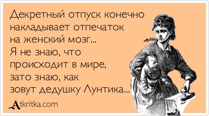 С момента, как я закончила первый свой институт и сразу по его окончании устроилась на работу, уходила с работы я только на новую работу. Не было перерывов больше двух недель. А тут - всё.. И теперь я поняла всю глубину высказывания «Зачем вы ходите на работу? - Ну как же. Ведь надо утром куда-то идти!». А тут - не надо. Девочки, вы бы знали, как меня эта мысль пугает. В данный момент даже больше, чем роды, ребенок, пеленки… В голову лезут страшные мысли..
