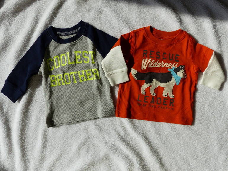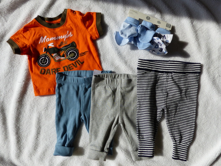 А это вещички недорогих фирм. Штанишки трикотажные 0-3 мес., те что потеплее(полосатые) 3-6 мес.Joe Fresh(Superstore), футболка и пинетки George(Walmart).