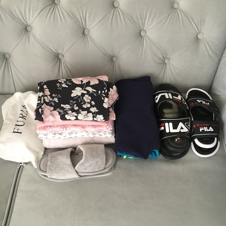 Здесь вещи для малышки, взяла 2 слипика, 2 ползунков, 2 боди с коротким рукавом и 1 с длинным, 3 пелёнки, 2 шапочки, 2 пар носочков и 2 царапок. В роддоме мы будем от двух до пяти дней, если не хватит вещей, то в любой момент муж может подвезти)