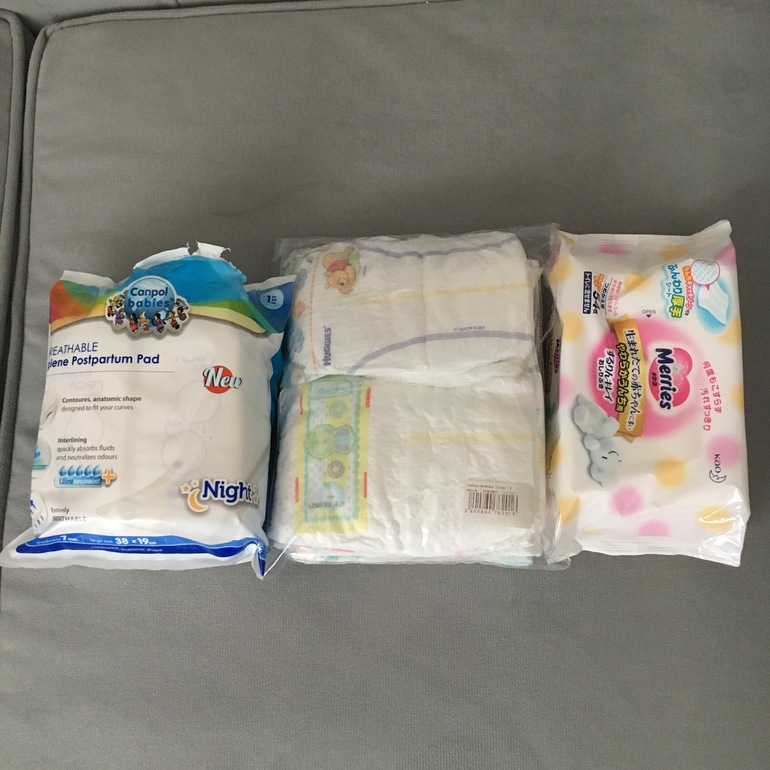 Не смотря на то, что средствами гигиены роддом снабжает полностью, я решила взять несколько штук памперсов, пелёнок, послеродовых прокладок, прокладок для груди и влажные салфетки.