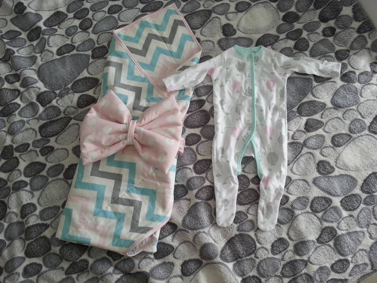 Наряд на выписку, решила вот такой, еле нашла ткань, (плед и бант-подушечку шила моя мама):