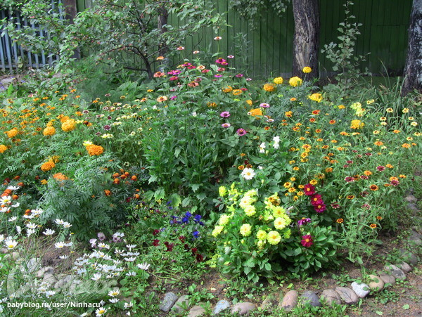 Наша клумба, обзорно. Георгины, циннии, шафраны, бархатцы, анютки...