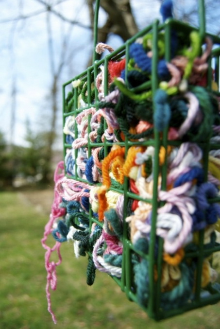 Если у вас скопилось много ненужных кусочков пряжи, сложите их в крупную сетку или клетку и подвесьте к дереву. Птицы совьют из них прекрасные разноцветные гнёзда