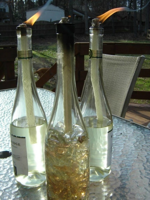 Сделайте такие «факелы» из старых винных бутылок посимпатичнее. Они помогут отогнать комаров.