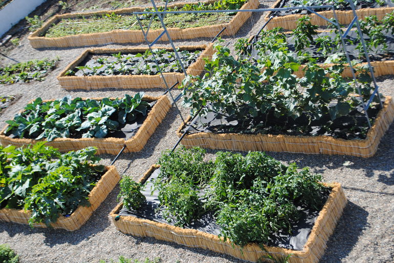 Спасибо. Про приподнятые грядки много инфо в интернете написано. Каркас собрали из брусьев, заполняли стружкой, песком, землей с перегноем, сверху геотекстиль и обернули камышовым матом, между грядок морская галька