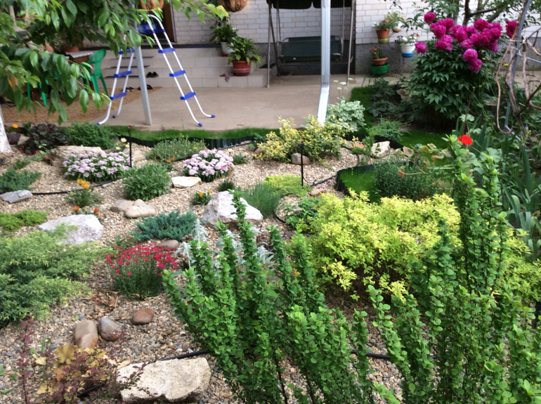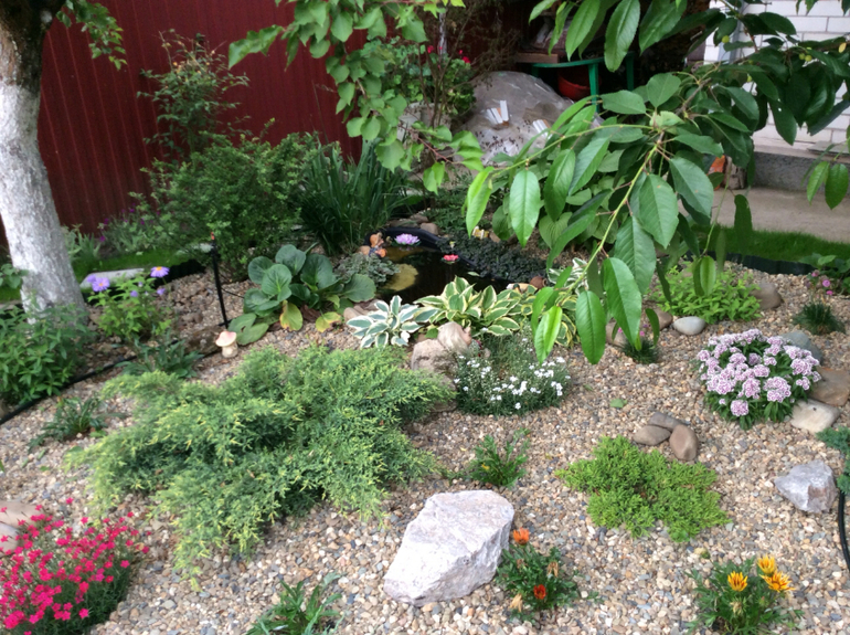 Ирина, спасибо большое! На вопросы с удовольствием отвечу:)Под гальку простилали спанбонд нетканный материал, он дышит и со временем перегнивает, но лет через 5, галька не толстым слоем, места под растения порезаны, и в них посажены растения, галька обсыпается не впритык, а немного остается земли вокруг растения, чтобы от нашей жары от горячих камней они не погибли. Можно делать даже микро рыхление. Спанбонд (не знаю вроде правильно слово пишу):) пропускает воду, вода проходит через гальку и через материал. Стоит несколько вертушек, для полива, проложен шланг, от заказывается в гальку, а стенды с распылителями на поверхности. Оооочень хорошая штука! Поливать в нашу жару много и часто, потому что много хвойников. Ландшафт лучше делать с марта до середины апреля, чтобы растения прижались до жары. Если хвойники сажать, то все лето обильно поливать, на следующий год меньше. Пруд маленький, нимфея искусственная. Можно попробовать посадить на такой глубине, возможно и хватит, но ее нужно на зиму убирать, а вряд ли это будут делать. Можно посадить водный гиацинт, ему не важна глубина, но на зиму тоже нужно будет убирать и пруд желательно закрывать. Если не хотите чтобы пруд мутнел, тогда не используйте растения в нем, а бросаем на весь сезон ее хватит, хлорная таблетка для плавательных бассейнов и вода супер чистая весь сезон и не одной лягушки:)