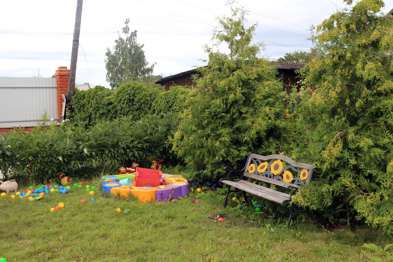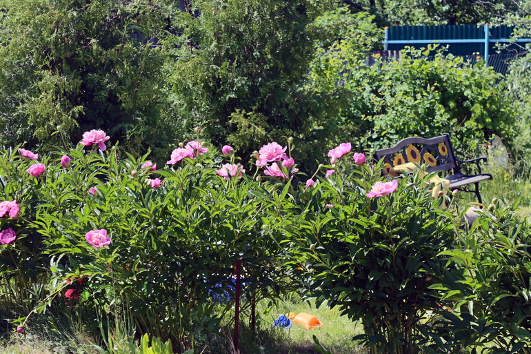 детский уголок. Отделила его с одной стороны пионами, люблю эти цветы за красивую пышную листву. Получилась "живая изгородь". Все розового цвета.