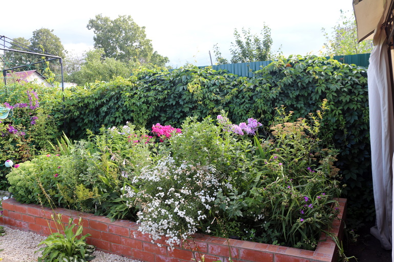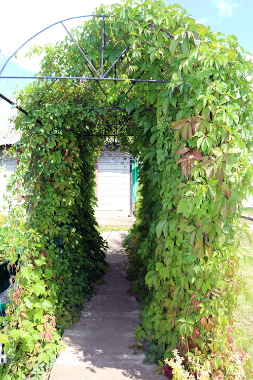 Огород у нас, как я уже говорила, первый год. А вот цветами мы занимались все 9 лет. В прошлом году поставили крепкую арку, которую уже почти полностью затянул "девичий виноград". Длина арки 10 м.
