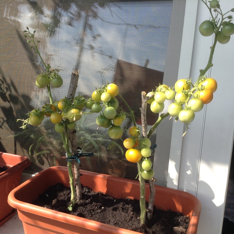 Вот фото, где все мелкие томаты смешаны: красные - Детская Радость и Спрут Черри, оранжевые - балконные, желтые лампочки - Медовая Капля.