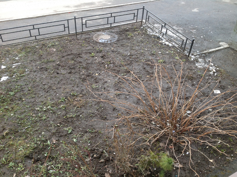 ПоговоримНедавно переехали в новую квартиру, живем на первом этаже. Растаял снег и хочется плакать, шучу, но с этим надо что-то делать. Сегодня сходила собрала большой мусор. Сторона очень темная, солнца тут почти не бывает. На месте газона грязь. Можно ли ее чем-то засеять, недорого) Есть такой куст, что это? Что с ним делать?