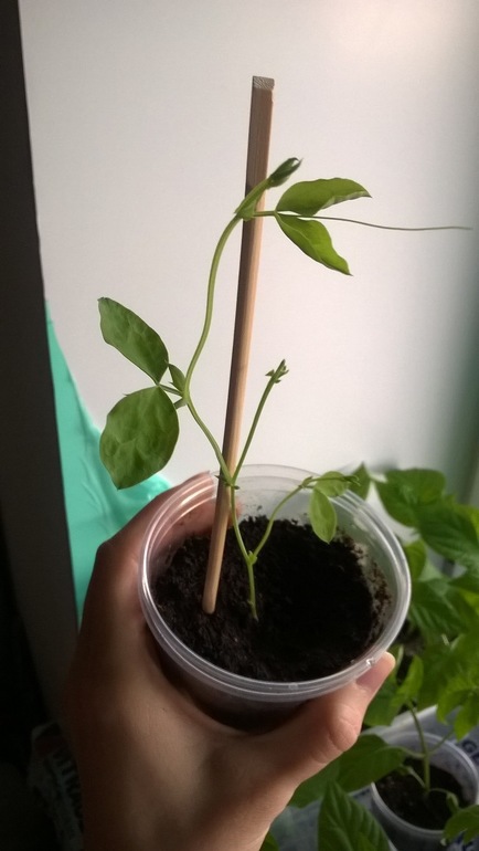 Циннии. Кошка их чуть не съела, успели вовремя! Один только выдернула с корнем. Перцы тоже успела поесть, пять штук съела, осталось 12 шт., было больше. Все растения, которые она попробовала, теперь сидят на втором этаже, закрыты от неё.Душистый горошек вырос только один к моему стыду!:))