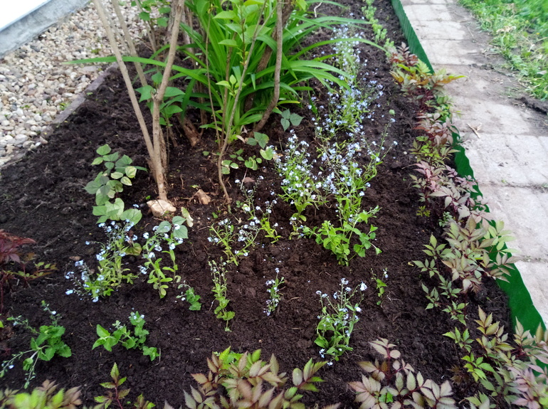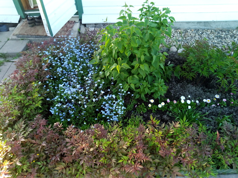 Незабудки уже готовыми букетами все еще скрупулезно собираю по участку и локализую сюда. Маргаритки пока ждут свежепосеянных братьев и нового места. После незабудок зацветет астильба. Она разошлась не на шутку и я с ужасом представляю, что ее скоро делить и прореживать. Пока приходится после цветения обстригать садовыми ножницами как кустарник, иначе пол дорожки перекрывает и незабудки задушит.