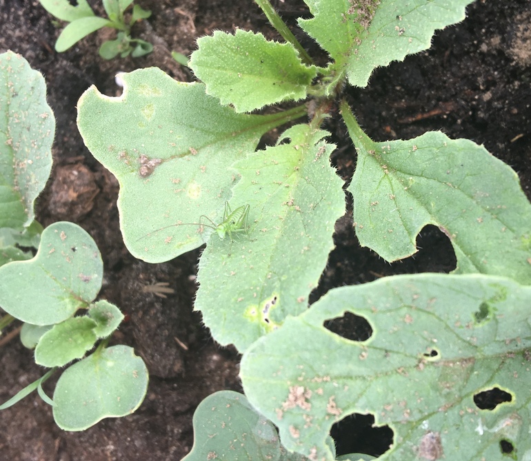 Сажаю в этом году первый раз: помидоры, огурцы, перцы, редис. Сажала редис в теплицу изначально, все листья оказались погрызены, причём дырки такие не маленькие. И нашла я там прыгающих существ! Самые маленькие песочного цвета, я подумала это кузнечики! Но они же не должны есть урожай! Потом эти мелкие становятся крупнеет зеленеют! Мне сказали - это саранча!