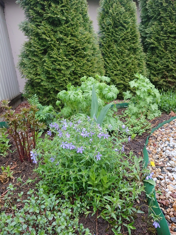Зацветает флокс растопыренный. Потом зацветет мыльнянка до осени. Дельфиниумы продаю. Огромные кусты, мне такие не надо. Это солнечная клумба.
