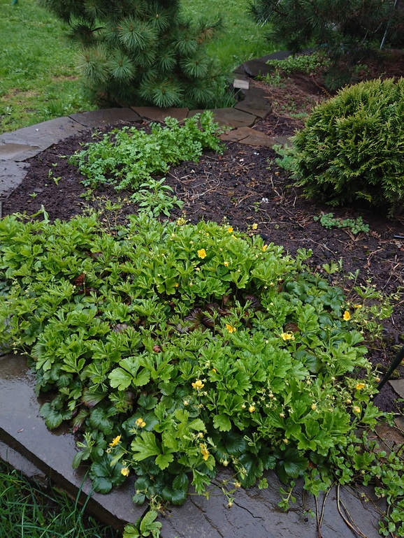 Вдоль забора ничего, кроме дюшении не выживает. Ну и пусть она будет. Зато сорняки не лезут.