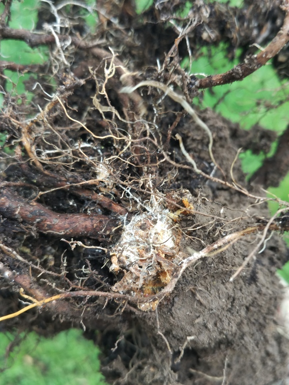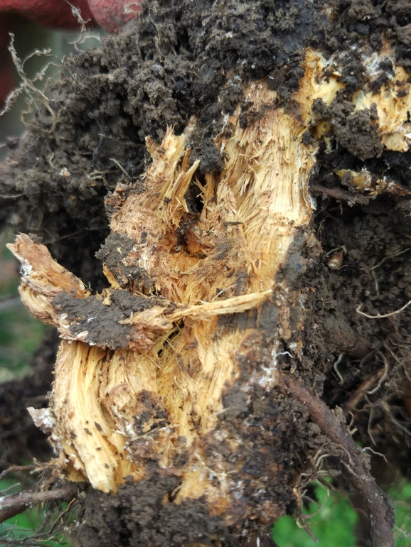 Виды заболеваний растительности и их обработка, лечение.Не так давно писала о том, что молодой куст черной смородины, посаженный в том году, не развивается, листья крошечные, прироста нет, ягоды единичные, без гроздьев. Я его и подкармливала, и обрабатывала, и обрезала... Сегодня решила выкопать, и вот такая картина... Корень центральный как труха, рукой проводишь, и часть корня оголяется, настолько он гнилой.