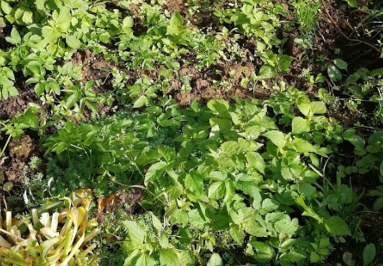 Если да то это сныть. У нее корни ползут очень. Наш участок был вросший ею, опытным путём выяснили, что очень она не любит когда её косят и обрывают листья от корней. Перекапывать все и выбирать корни из земли нереально, так как даже кусочек корня даст побег. Еще не любят, когда её топчут.