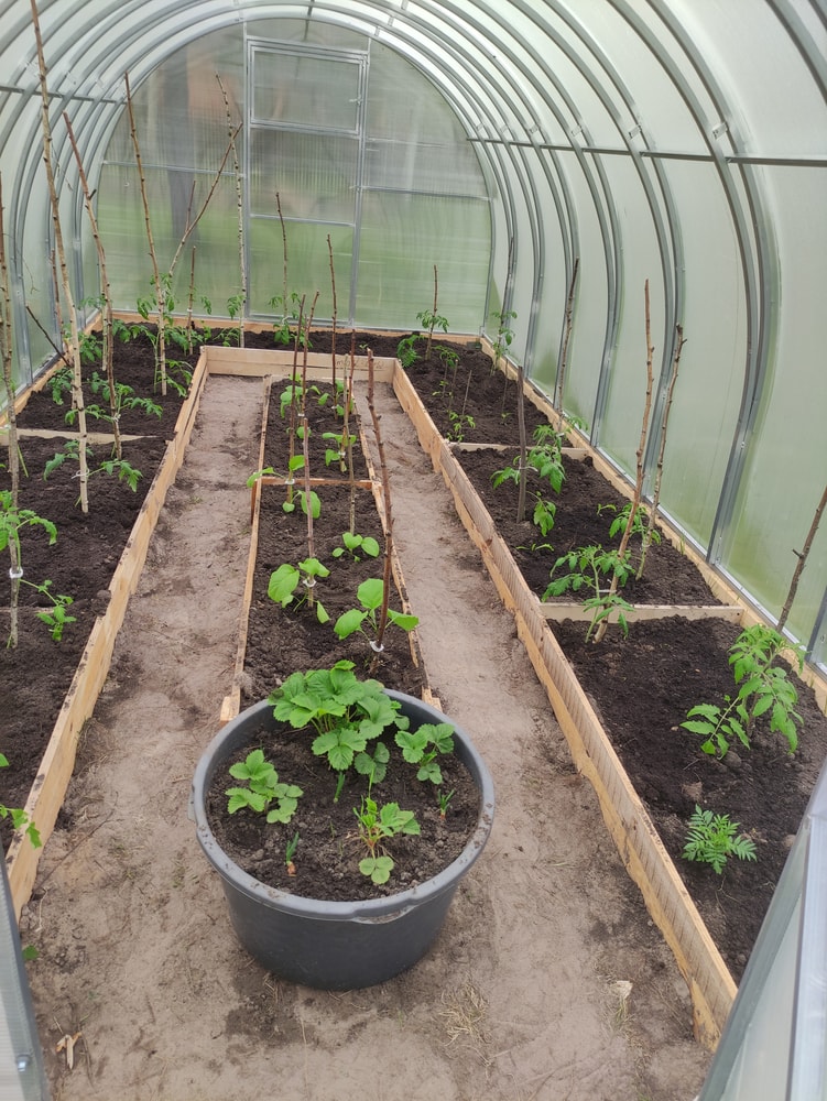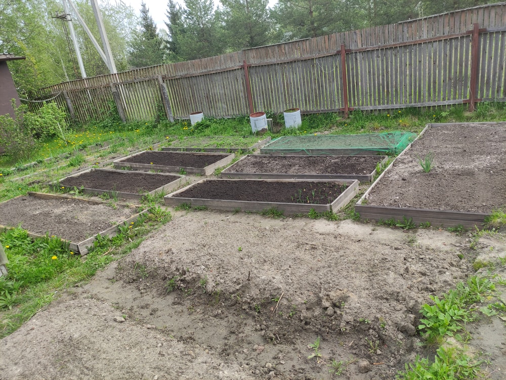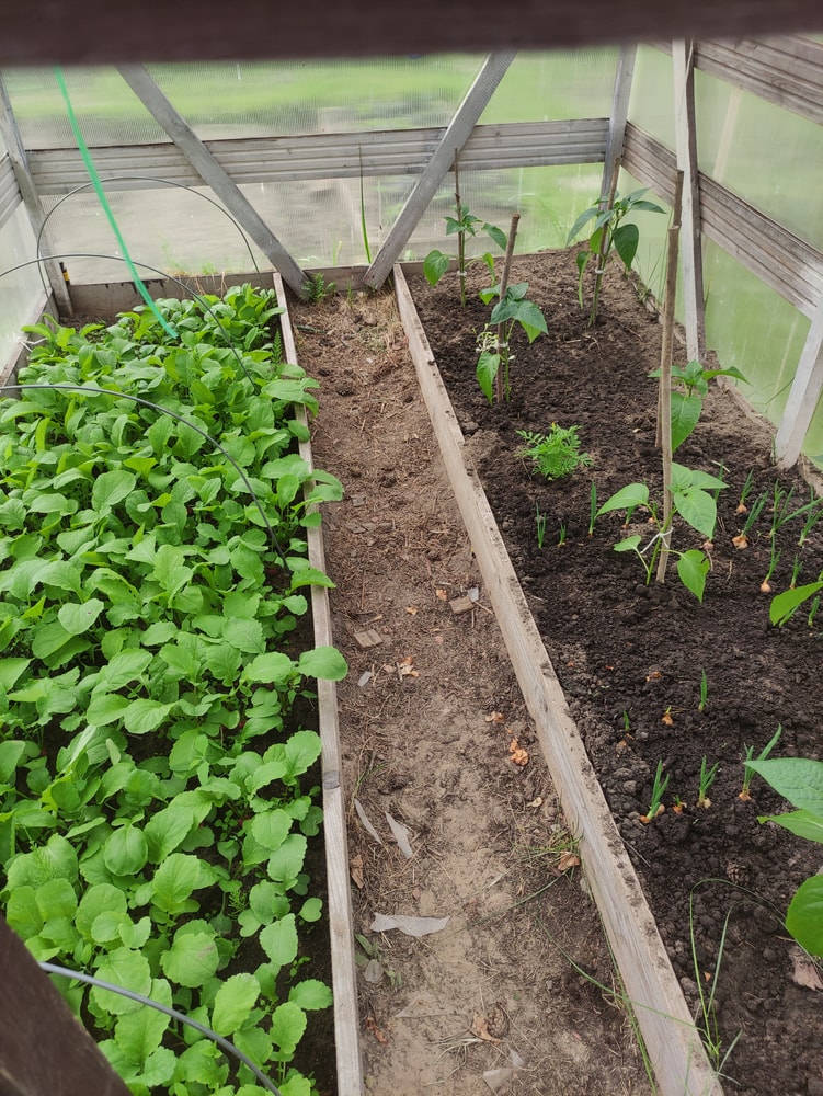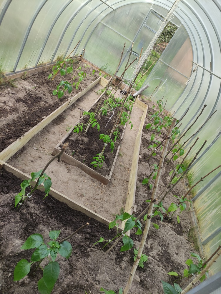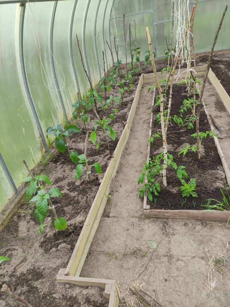 Три теплицы (помидоры, огурцы, баклажаны, перец) и 16 грядок в огороде посажено. Осталось две : горох и томаты на улице. Льет третий день. Ждём, когда солнце будет.