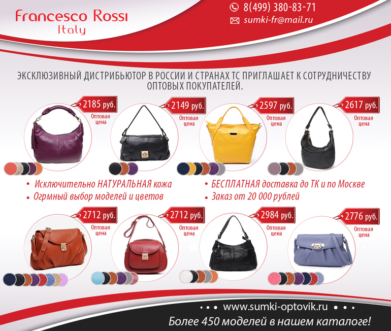 Женские сумки, клатчи, кошельки и ремни Francesco Rossi исключительно из НАТУРАЛЬНОЙ КОЖИ оптом