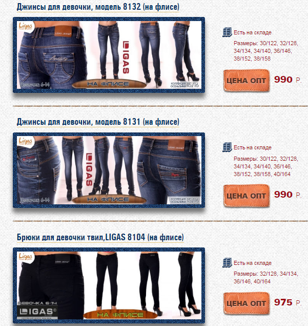 В широком ассортименте представлена джинсовая одежда ТМ: «LIGAS», «Arnold», «Robot Fish», «Green Panire», «Mock up», «Rocket» «Kandylok» «Mine sigil» «Miss code» «Amadge»