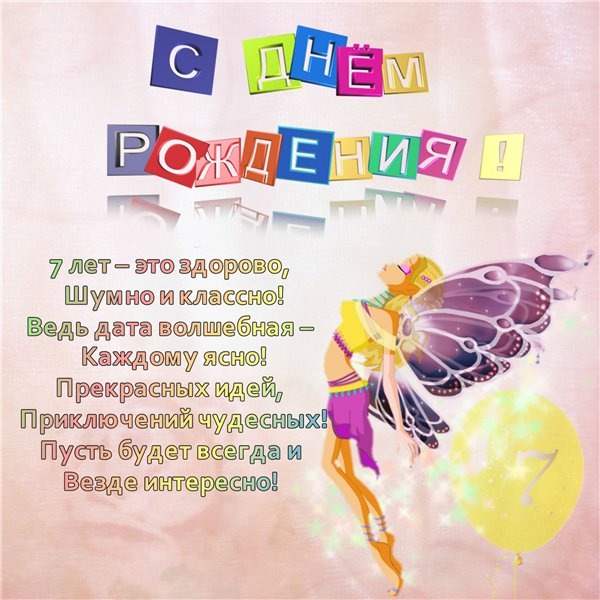 С седьмым днем рождения! Пусть и этот день, и каждый последующий будут радостными и счастливыми. Пусть друзья всегда будут верными, уроки - простыми, а родители - самыми лучшими на свете. С праздником тебя! Побеждай и получай именно то, что тебе всегда хотелось.