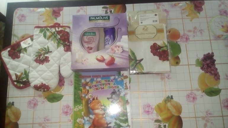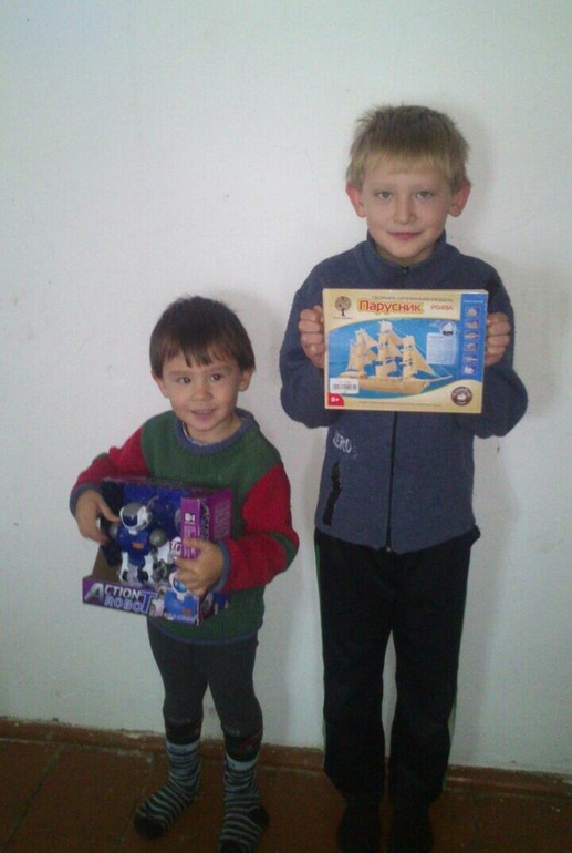 Дети часто мои когда получаем посылки окружают ее и любопытно ждут когда мама откроет посылку ))) И в этот раз дети окружили меня и ждали когда я ее открою)) Открыв посылку от Евгении дети , а особенно младший сын запищал от радости запрыгал и кричит "Обат " что значить Робот ))) там была игрушка Робот на пульте управления , он даже поцеловал его и меня)) и воздушные поцелуйки , он шлет доброй феи тети Евгении.Конструктор деревянный по сбору корабля для сына Кирилла , он его уже собирает ))),Полотенчики и прихваточки,подарочный набор гель для душа и дезодорант ,лекарства для сына пантогам , книжки для дочи , она их рассматривает и спрашивает меня это кто?)).Спасибо за вещи для старшой дочери. Огромное спасибо за такие чудесные подарки !!!! Дай Бог вашей семье здоровья и счастья !!! Да убережет вас Бог от всех ненастей и хвори!!! Мира процветания вашему дому!!!!