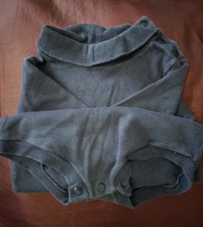 Синий бодик, выдрана кнопка между ног. Длина от горла вниз 39 см, размер не знаю.