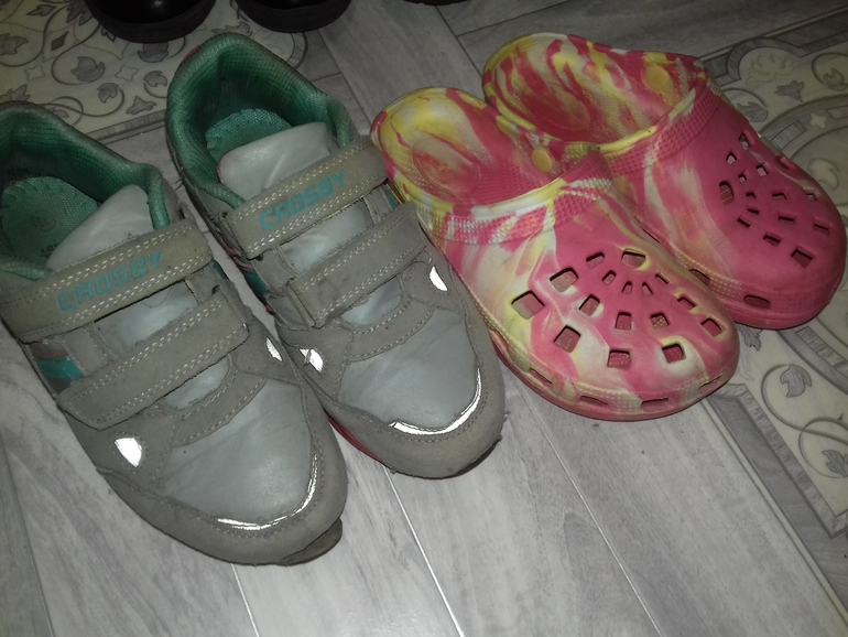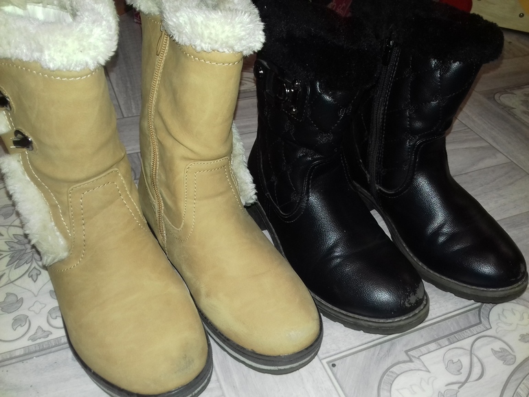 Имеются потёртости на мысах, у кроссовок немного подклеить надо, на высоком черном сапоге (2 фото) несквозной порез около молнии
